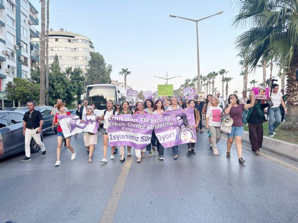 Kushimoto Sokağı’ndan Özgecan Aslan Barış Meydanı’na yürüyen kadınlar sloganlar ve alkışlarla kadın cinayetlerini, tacizleri, çocuk istismarını protesto etti. Yürüyüşte aynı zamanda Narin Güran için pankart açıldı. Sahil yolunda yürüyüşü engellemek isteyen polislerin kurduğu barikatı aşan kadınlar, yürüyüşlerini Özgecan Aslan Barış Meydanı’nda tamamladı.