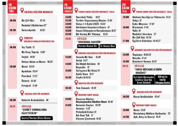 Kandemir, festivalin açılışın ardından 18 Ekim’de saat 18.00’de Silifke Kültür Merkezinde ve Tarsus Bağlarbaşı Köyünde açık hava gösterimiyle devam edeceğini söyledi.Aynı tarihte Haçova Kültür Derneğinde de 18.30’da Gazeteci Diren Keser’in “Haberin Ardındakiler” adlı belgesel filmi gösteriminin yapılacağını ifade eden Kandemir, hemen ardından Keser ile birlikte “Şiddet Sarmalında Gazetecilik” söyleşisinin yapılacağını dile getirdi. Kandemir sözlerini şöyle sürdürdü:  “19 Ekim saat 13:00 de Toroslar Belediyesi Yunus Emre Kültür Merkezi, Akdeniz Belediyesi Konferans Salonu, Mersin Tabip Odasında, saat 19:30 da Haçova Kültür Derneği’nde film gösterimleri başlayacaktır.  Yine aynı tarihte Yunus Emre Kültür Merkezi’nde saat 17:00’de yönetmen Kazım Öz’ün “Bir Varmış Bir Yokmuş” filminin ardından filme dair kısa bir söyleşi yapılacak. Ardından ise saat 17:30 da yönetmen Kazım Öz ve Akademisyen Sonay Ban ile “Sinemada Sansür” söyleşisi gerçekleştireceğiz. 20 Ekim Pazar günü yine aynı salonlarda ve saatlerde film gösterimlerimiz devam edecek. Akdeniz Belediyesi Konferans Salonunda ise saat 17:00 de Enerji Sen genel başkanı Süleyman Keskin ve Özel Sektör Öğretmenleri Sendikası genel başkanı Eren Edebali’nin konuk olduğu “Emek Mücadelesinin Bugünü” başlıklı söyleşi yapılacaktır.”
