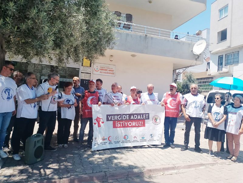Sağlık emekçileri adına basın açıklaması yapan Mersin Tabip Odası Başkanı Uzm. Dr. İzzet Çalış, 4 aydır “Vergide Adalet” isteğiyle Sağlık Bakanı’na, Maliye Bakanı’na seslendiklerini anımsatarak, “Sağlık Bakanı yurttaşlarımızın ne kadar çok hastalanıp ne kadar çok şehir hastanelerine gittiğinden bahsediyor, onaylı/onaysız randevu peşinde koşuyor. Halkımız gibi Sağlık Bakanı da randevu derdine düşmüş durumda. Maliye Bakanı vergilerin yüzde 80’ini ödediğimiz yetmezmiş gibi, halen yeni vergiler peşinde, ‘vergiyi tabana yayacağız’ diyor. Bakan özel hastanelerin kıskacından bunalıp kaçmış hekimlerden peşin vergi almaya çalışırken, ülkenin tüm gelirinin aktığı şirketlerden yüzde 15 vergi almayı hedef diye söylüyor. Bu ülkede kazanılan her bir liranın yarısını kazanandan vergilerin yüzde 15’i bile alınmıyor. İsrafın kaynağı bizmişiz gibi yine hekimler hedef gösteriliyor.
